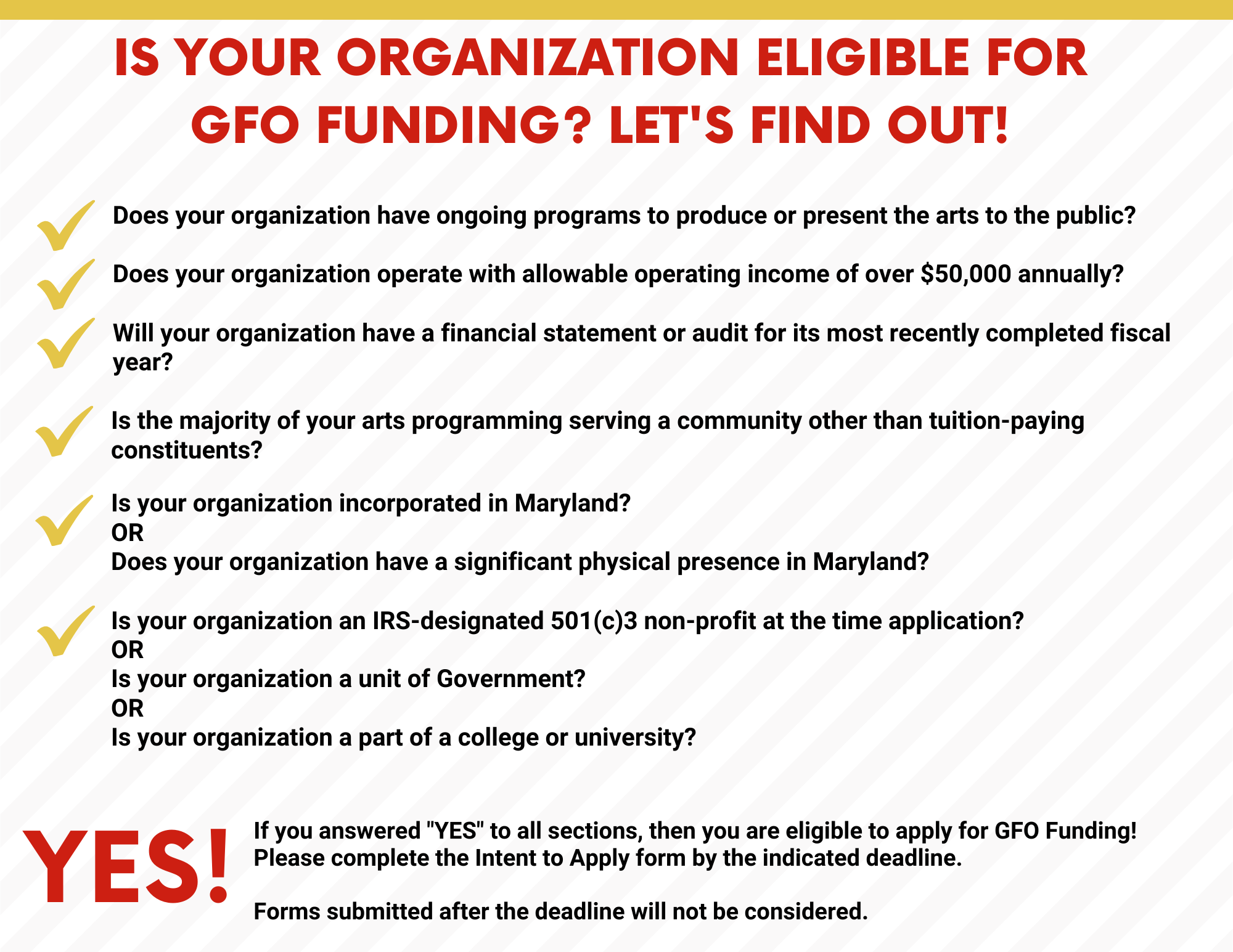 Interested in applying for the FY 2026 Grants for Organizations program? Have questions about the application process? Check out the resources below.If you were not able to confirm all five questions in the chart above but are still interested in learning more about the growth of your arts organization, please let us know how we can help by connecting you with GFO Program Staff.